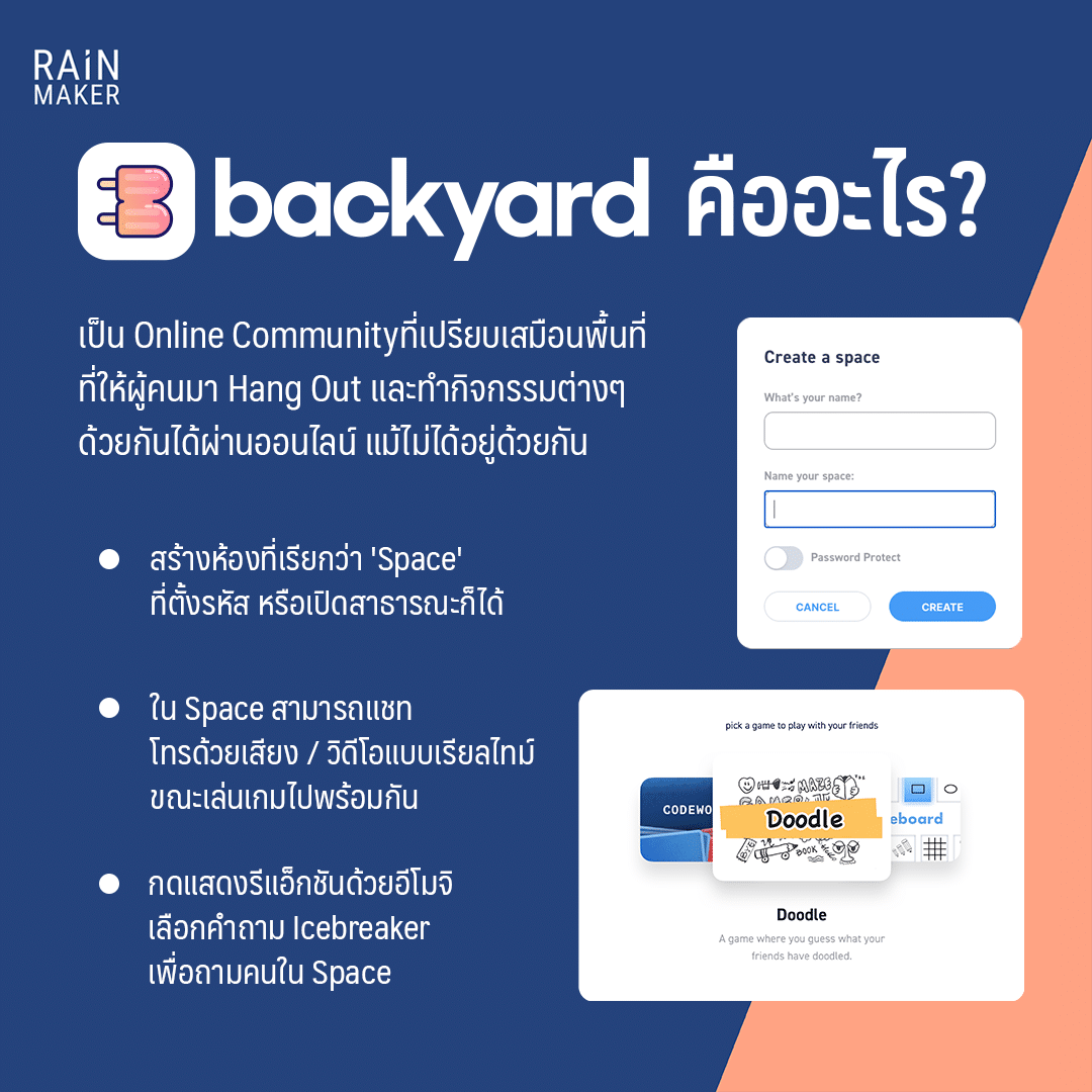 Backyard เป็น Online Community ที่เปรียบเสมือนพื้นที่ๆ ให้ผู้คนมา Hang Out และทำกิจกรรมต่างๆ ด้วยกันได้ผ่านออนไลน์ แม้ไม่ได้อยู่ด้วยกัน โดยสามารถสร้างเป็นห้องขึ้นมา เรียกว่า ‘Space’ เหมือนห้องประชุมห้องหนึ่ง ซึ่งจะตั้งรหัสไว้ให้เฉพาะกลุ่มเพื่อน หรือจะเปิดสาธารณะให้ใครเข้ามาก็ได้ นอกจากนี้ยังสามารถตั้งชื่อห้อง ตั้งรูปภาพได้ตามใจชอบเลย