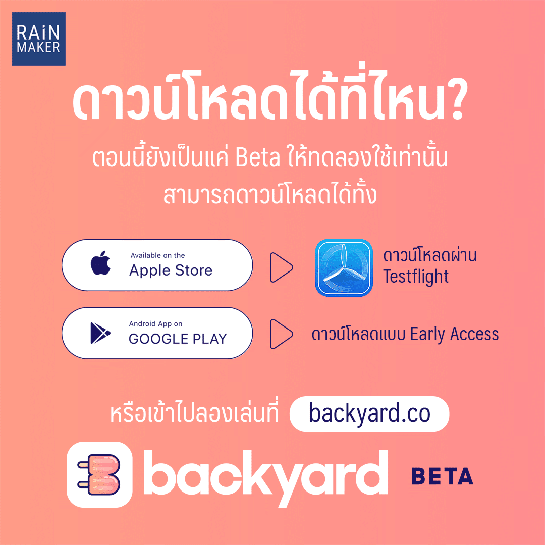 ถึงแม้ตอนนี้ตัวแอปพลิเคชันจะออกมาเป็นแค่ Beta ให้ทดลองใช้กันเท่านั้น เพราะยังอยู่ในระหว่างการพัฒนา แต่ก็มีให้ทดลองทั้งบน iOS (ต้องดาวน์โหลดแอปพลิเคชัน TestFlight ก่อน) และ Android หรือสามารถเข้าผ่านเว็บเบราว์เซอร์ Backyard.co ก็ได้ แล้วจะรออะไรกันอยู่ล่ะ รีบชวนเพื่อนไป Hang out กันได้เลย! หรือจะเข้าไปอ่านรายละเอียดเพิ่มเติมสำหรับ Backyard บนสมาร์ทโฟน ก็ได้นะ