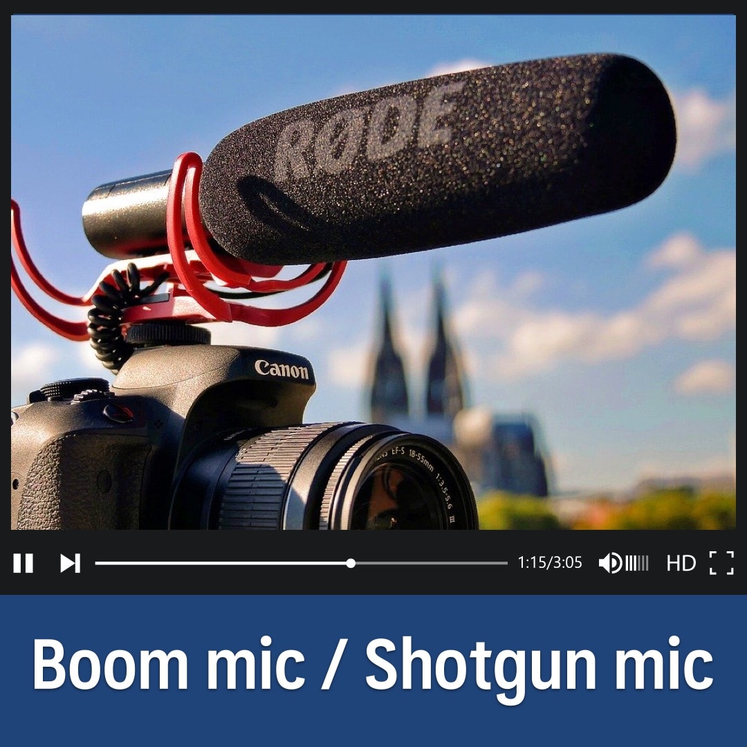 ไมค์บูม / ไมค์ช็อตกัน / ไมค์ติดหัวกล้อง (หรือบางครั้งก็ได้ยินคนเรียกว่าไมค์ขน ฮ่าๆ) อุปกรณ์ไมค์ที่คนถ่าย vlog ใช้กันประจำนอกจากไมค์ที่ติดอยู่กับผู้พูด โดยส่วนนี้จะเป็นอุปกรณ์ที่ติดอยู่กับตัวกล้องใช้สำหร้บรับเสียงวงกว้าง ในระยะที่ไม่ไกลมากนัก
