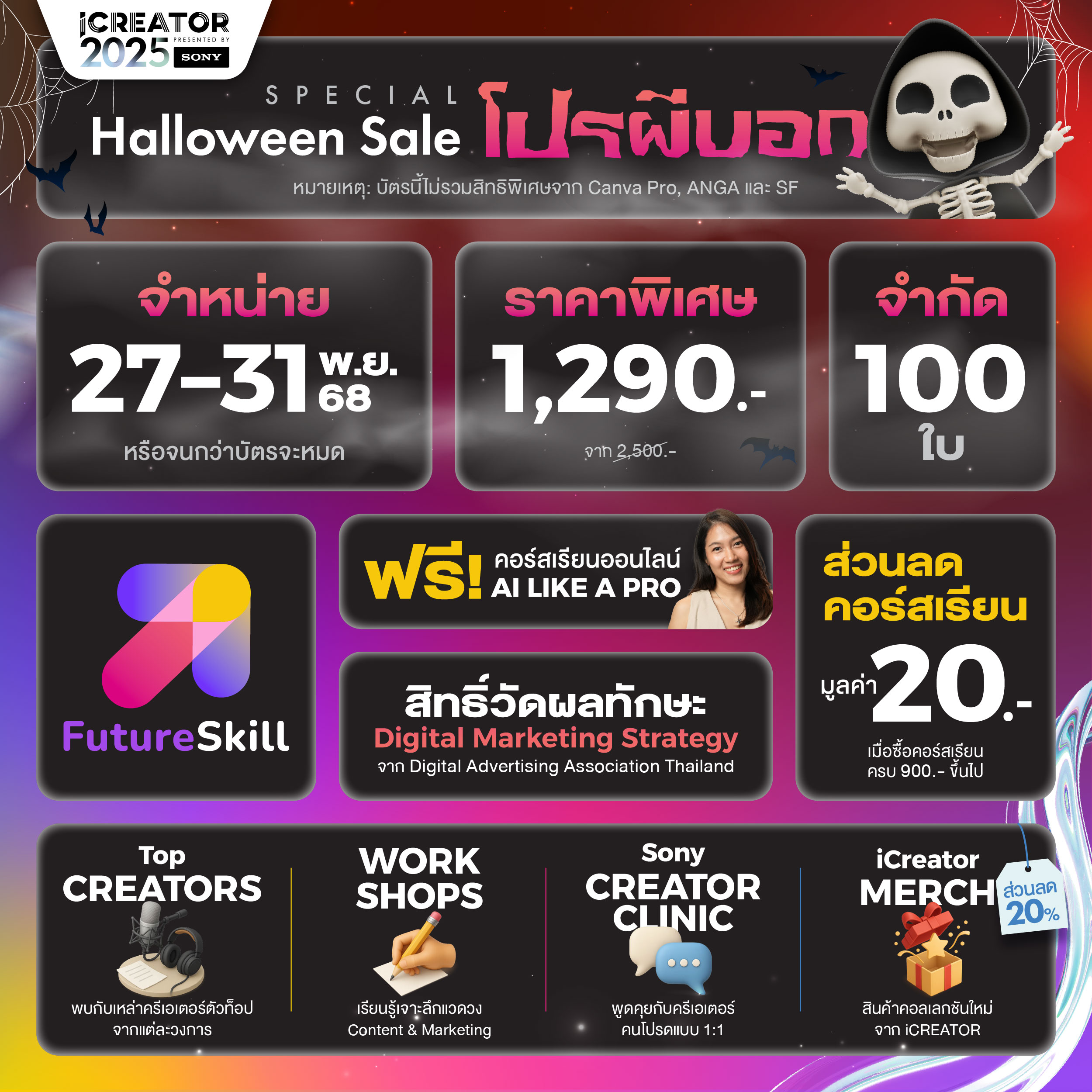 นี่คือโอกาสสำหรับเหล่าครีเอเตอร์ อินฟลูเอนเซอร์ แบรนด์และเอเจนซีที่ต้องการมาเติมไฟและเติมเส้นทางสู่อนาคตไปด้วยกันที่งาน iCreator Conference 2025 Presented by Sony: Awaken The Future ปลุกพลังอนาคตที่กำหนดได้ ที่บัตร [Special] Early Bird ยกทัพโปรโมชันคอลแลบกับสิทธิพิเศษมาให้เลือกเพียบ พร้อมขยายวันขายบัตรไปจนถึง 25 พ.ย. 68 นี้!