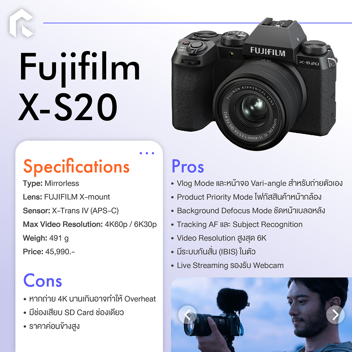 กล้อง Mirrorless ที่เพิ่มฟังก์ชัน ‘Vlog Mode’ ที่เหมาะสำหรับคนสำหรับคนที่ชอบ Vlog และโหมด ‘Film Simulation’ ฟีเจอร์ที่ช่วยปรับโทนสีถึง 19 แบบ เหมาะกับผู้ใช้งานทุกระดับ โดยภาพรวมการใช้งานและการควบคุมค่อนข้างง่าย รวมถึงพกพาสะดวก