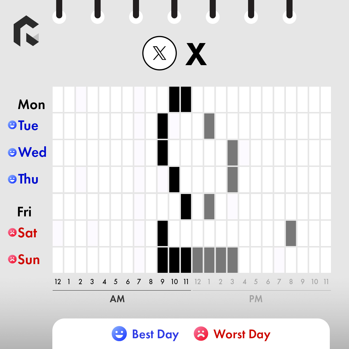 เวลาที่ดีที่สุดในการโพสต์บน X อยู่ในช่วงเช้าและบ่ายตั้งแต่ 09.00 – 11.00 น. รวมถึงผู้ใช้งานมักจะเช็กหน้าฟีด X ในช่วงระหว่างพักเที่ยง เพราะฉะนั้นเวลาที่เหมาะสมในการโพสต์จะเป็นตอน 13.00 น. และวันที่เหมาะสมในการโพสต์คือ วันอังคาร, วันพุธ และวันพฤหัส ส่วนวันที่ไม่เหมาะในการโพสต์คือวันเสาร์และวันอาทิตย์