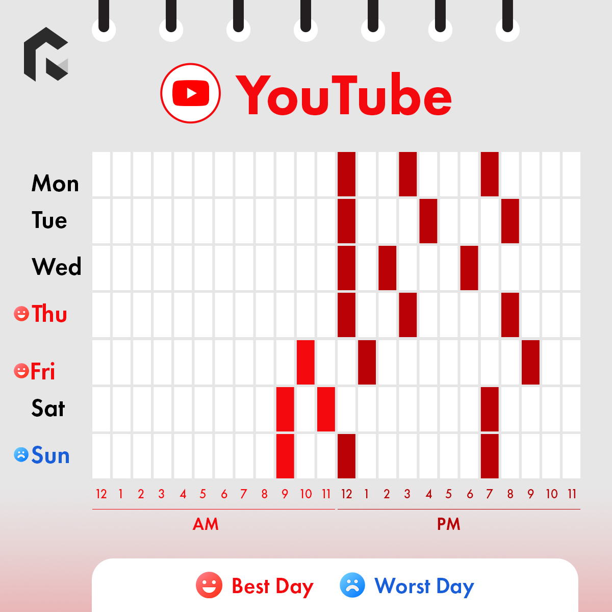 เวลาที่เหมาะในการโพสต์คลิปบน YouTube ในวันธรรมดาคือ 14.00 – 16.00 น. และวันเสาร์-อาทิตย์ เวลา 09.00 – 11.00 น. ซึ่งวันที่เหมาะสมที่สุดในการโพสต์คือวันพฤหัสและวันศุกร์ ส่วนวันที่ไม่เหมาะสมในการโพสต์ที่สุดคือวันอาทิตย์