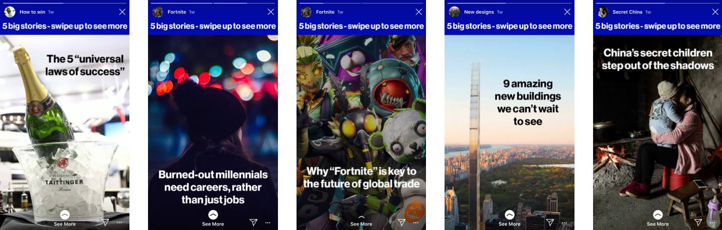 - ใช้ Story เป็นช่องทางเติมเต็ม Bloomberg มีรายการคอนเทนต์บน Story ที่มีชื่อว่า 5 Big Stories ที่นำเรื่องราวหรือบทความบนเว็บมาเป็น Story (รวม ๆ กัน) 1 Story สำหรับ 1 บทความ แล้วใส่ลิ้งค์เข้าไป (ฟังดูทำง่าย ๆ มาก) แต่กลับมียอดการคลิกเข้าไปอ่านบทความมากถึง 25%
