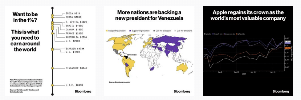 - ใช้ภาพแบบ Infographic เข้ามาช่วย เนื่องจาก Bloomberg เป็นเว็บในแนว ๆ ชวนวิเคราะห์ ดังนั้นการสร้างภาพประกอบที่ทำให้ผู้ชมเกิดการตั้งคำถาม หรือเห็นภาพอะไรในมุมมองที่ต่างไปจากเดิมก็จะเป็นเรื่องที่ดี ผลงานที่เราเห็นได้ชัดจากของ Bloomberg ก็จะมีทั้งภาพ กราฟ อินโฟ ต่าง ๆ ที่จัดทำได้ค่อนข้างสวยงาม เช่น ถ้าจะลงข่าวว่า Apple เป็นบริษัทที่มีมูลค่าสูงที่สุดในโลกก็อาจจะลงเป็นกราฟหุ้นแทนการลงภาพร้าน Apple Store อย่างเดียว