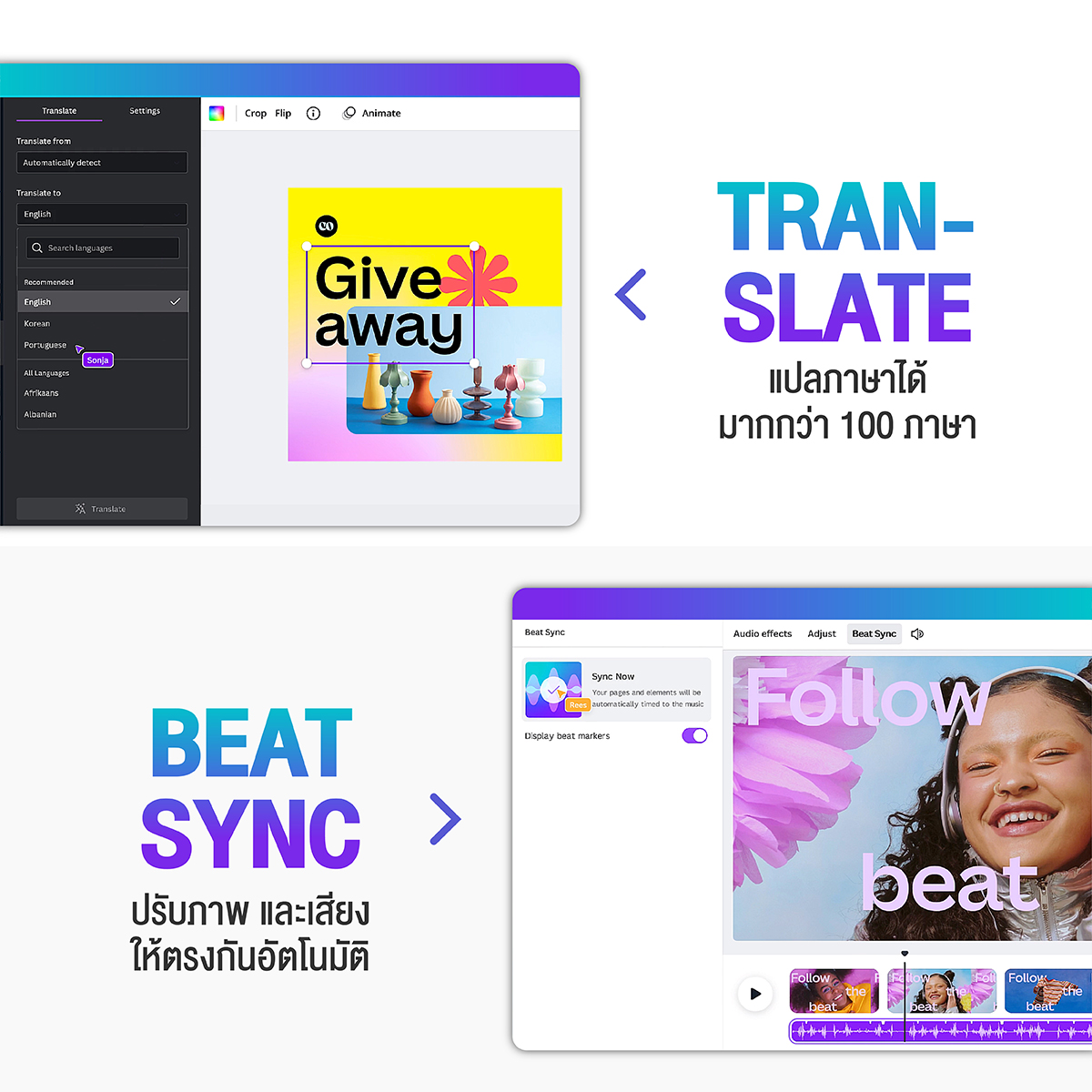 Canva ก็มีฟีเจอร์รองรับการทำงานรูปแบบวิดีโอให้สะดวกมากยิ่งขึ้น เพราะเพียงใส่คลิป และเปืดใช้งานฟีเจอร์นี้ ก็ปรับให้ภาพ และเสียงตรงกันอัตโนมัติได้นะ แถมประหยัดเวลาการทำงานไปได้เยะเลยทีเดียว