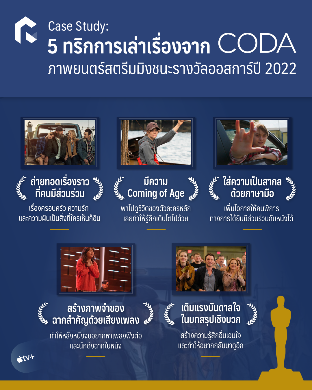 เมื่อวันจันทร์ที่ 28 ที่ผ่านมา ผู้ชนะรางวัลสาขา Best Picture หรือภาพยนตร์ยอดเยี่ยมในงาน Oscars ครั้งที่ 94 ได้ตกเป็นของ CODA ภาพยนตร์เรื่องแรกจากแพลตฟอร์มสตรีมมิง Apple TV+ ที่ชนะรางวัล ว่าด้วยเรื่องราวชวนให้อิ่มเอมที่ไม่ว่าใครได้ดูแล้วเป็นอันต้องรู้สึกได้เติมเต็มบางอย่างในหัวใจ โดยเฉพาะเรื่องของครอบครัว ความฝัน และความรักที่ครบรส และเรียบง่าย แต่ทรงพลังในตัวเอง วันนี้ทาง RAiNMaker เลยอยากพาทุกคนมาแกะบทเรียน 5 ทริกการเล่าเรื่องของหนังที่ขึ้นชื่อได้ว่าเป็นภาพยนตร์ยอดเยี่ยมแห่งปีกัน!