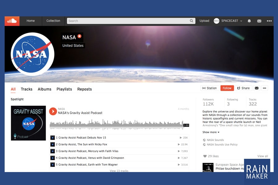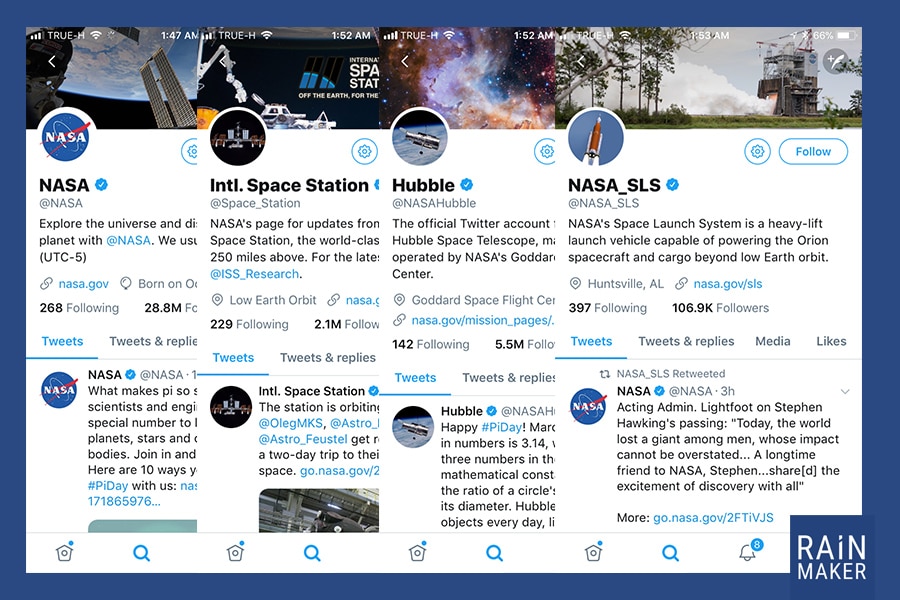 หน่วยงานนั้นก็คือ NASA บางคนอาจจะไม่รู้ แต่ NASA นั้นมีช่องทางการสื่อสารต่าง ๆ แทบจะทุกช่องทาง ตั้งแต่ Facebook, Twitter, Instagram, Snapchat, Youtube และช่องทางอื่น ๆ อีกนับ 10 เรียกได้ว่า แทบจะเจาะตลาดทุกโซเชียลมีเดียเลยทีเดียว