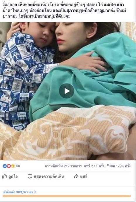 เป็นคอนเทนต์ทั่วไป ไม่ได้ใช้แฮชแท็คใดๆบนโพส เป็นคลิปของ เป้ย ปานวาด และลูกชายอย่างน้องโปรดที่กำลังอ้อนคุณแม่ซึ่งป่วยอยู่บนเตียง ในช่วงนี้แม่เป้ย มีข่าวลือว่าถูกคุณสามีนอกใจ จนเป็นข่าวที่คนอินติดเทรนด์โซเชียลต่างๆ ทำให้มียอดแชร์ที่ 2,100 แชร์ แต่มีการเข้าถึงเพียง 389,072 คนเท่านั้น