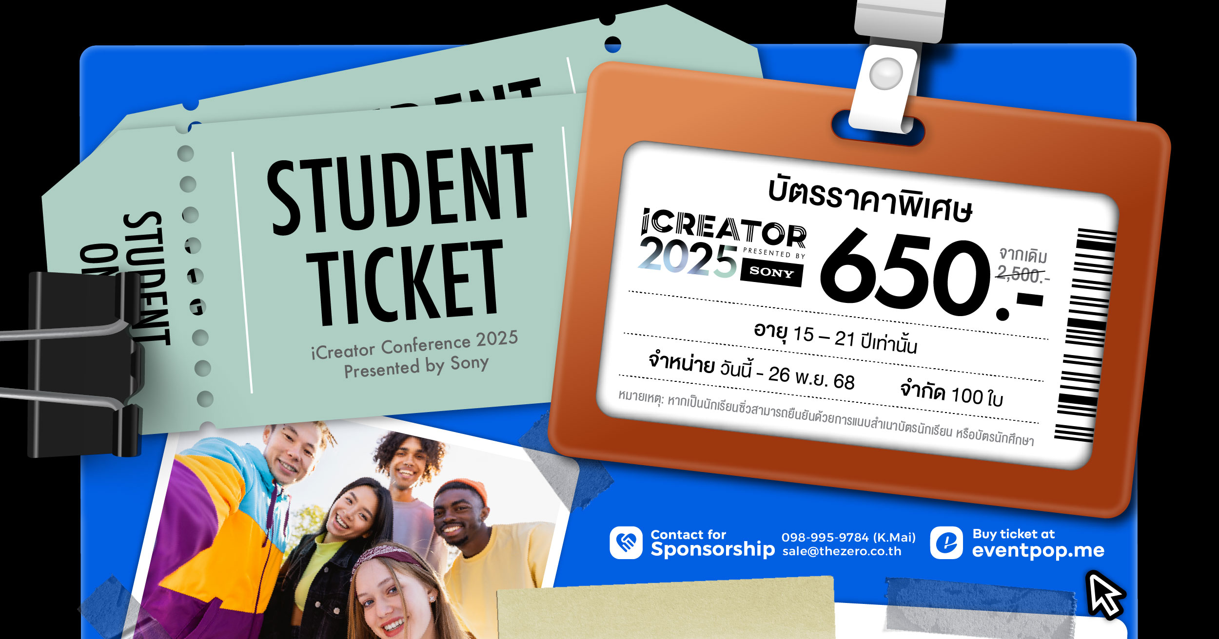 งาน iCreator Conference 2025 Presented by Sony ไม่ได้เป็นเพียงแค่งานรวมตัวครีเอเตอร์ระดับท็อปของไทย แต่ยังเป็นงานที่เปิดโอกาสให้เหล่านักเรียนและนักศึกษาที่มีความฝันอยากเป็นนักสร้างคอนเทนต์ หรืออัปสกิลในการเป็นครีเอเตอร์เพื่อทำช่องของตัวเอง ต้องซื้อบัตรนี้! STUDENT TICKET ราคาพิเศษแห่งปี
