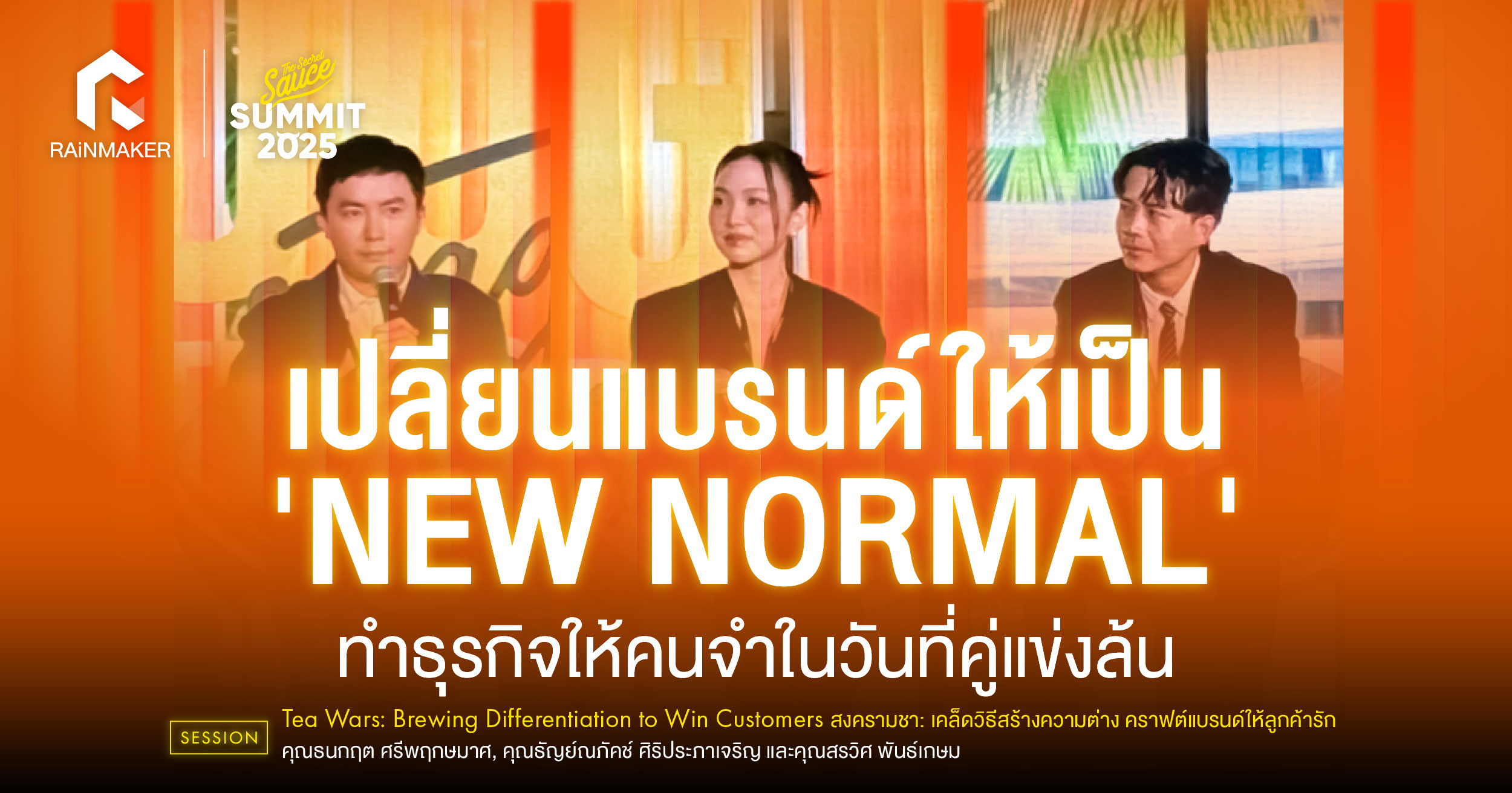 เปลี่ยนแบรนด์ให้เป็น ‘New Normal’ ทำธุรกิจให้คนจำในวันที่คู่แข่งล้น จากเซสชัน Tea Wars: Brewing Differentiation to Win Customers สงครามชา: เคล็ดวิธีสร้างความต่าง คราฟต์แบรนด์ให้ลูกค้ารักโดย ธนกฤต ศรีพฤกษมาศ, ธัญย์ณภัคช์ ศิริประภาเจริญ และสรวิศ พันธ์เกษม ในงานThe Secret Sauce Summit 2025