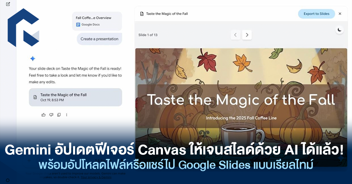 Google เปิดตัวฟีเจอร์ใหม่สำหรับ Gemini’s Canvas ซึ่งเป็นพื้นที่ทำงานกับแชทบอทแบบโต้ตอบฟรีด้วย AI โดยออกแบบมาเพื่อช่วยเหลือนักเรียน และพนักงานบริษัทที่ต้องการสร้างสไลด์เพียงแค่ป้อนคำสั่งเท่านั้น นอกจากนี้ยังสามารถอัปโหลดเอกสารอย่างรายงานวิจัยหรือชีตให้ Gemini ทำงานนำเสนอจากแหล่งข้อมูลดังกล่าวได้