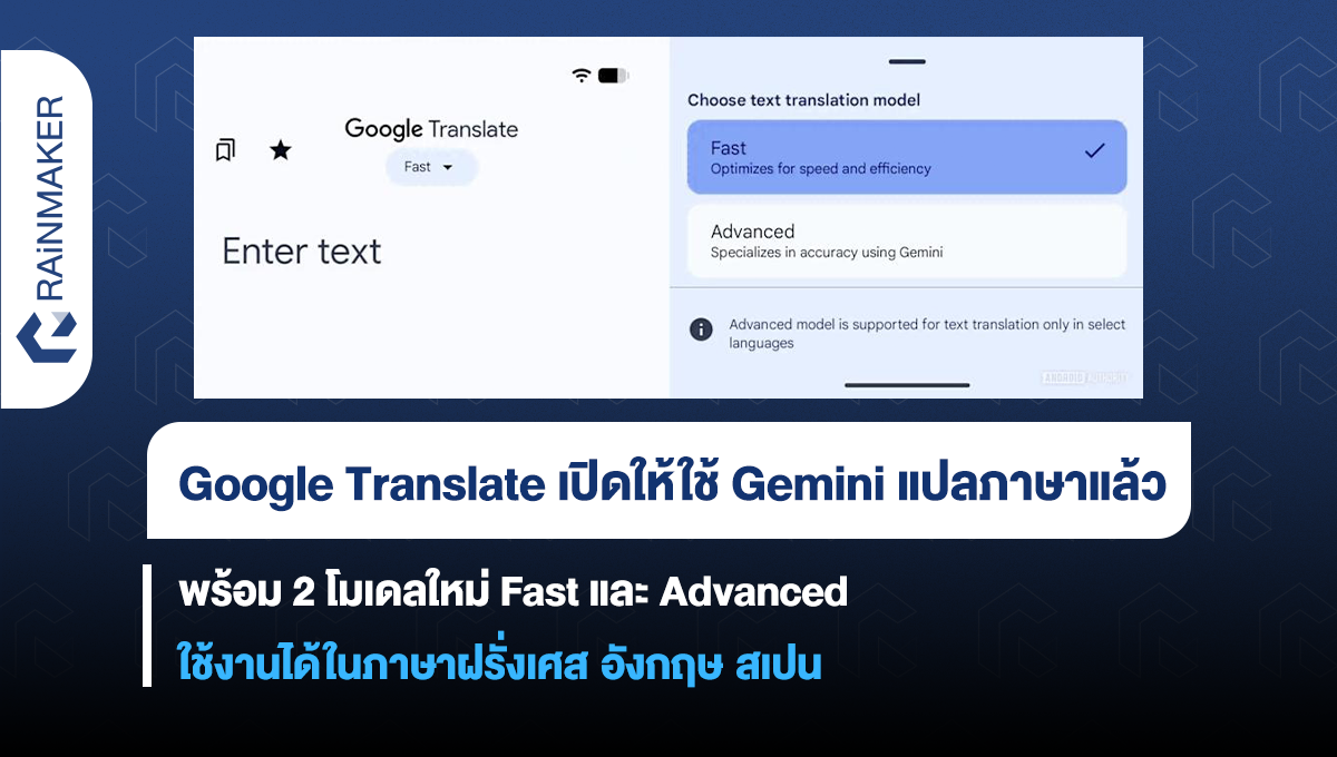 Google อัปเดตแอปพลิเคชัน Translate เวอร์ชันใหม่ที่มาพร้อมฟีเจอร์ช่วยแปลภาษาขับเคลื่อนด้วยโมเดล AI อย่าง Gemini เพื่อให้ได้การแปลที่แม่นยำยิ่งขึ้น โดยฟีเจอร์นี้จะแสดงผลเป็นตัวเลือกด้านบนของหน้าหลักก่อนการป้อนข้อความ ซึ่งผู้ใช้จะสามารถเลือกระดับการใช้งานได้ 2 โหมด ได้แก่ Fast และ Advanced รวมถึงใช้งานฟรีด้วย