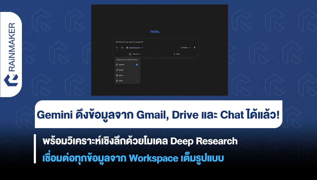 ล่าสุดโมเดล Deep Research จาก Gemini สามารถดึงข้อมูลจาก Google Search, Gmail, Drive และ Chat พร้อมกับการค้นคว้าเชิงลึกด้วยการใช้ข้อมูลต่าง ๆ ของผู้ใช้ โดยแพลตฟอร์มกล่าวว่า นี่เป็นหนึ่งในฟีเจอร์ที่ได้รับเรียกร้องมากที่สุด เพื่อเป็นผู้ช่วยในการทำงานแบบเป็นขั้นตอน ไปจนถึงการวิเคราะห์แบบครบถ้วน และเข้าใจบริบทมากขึ้น
