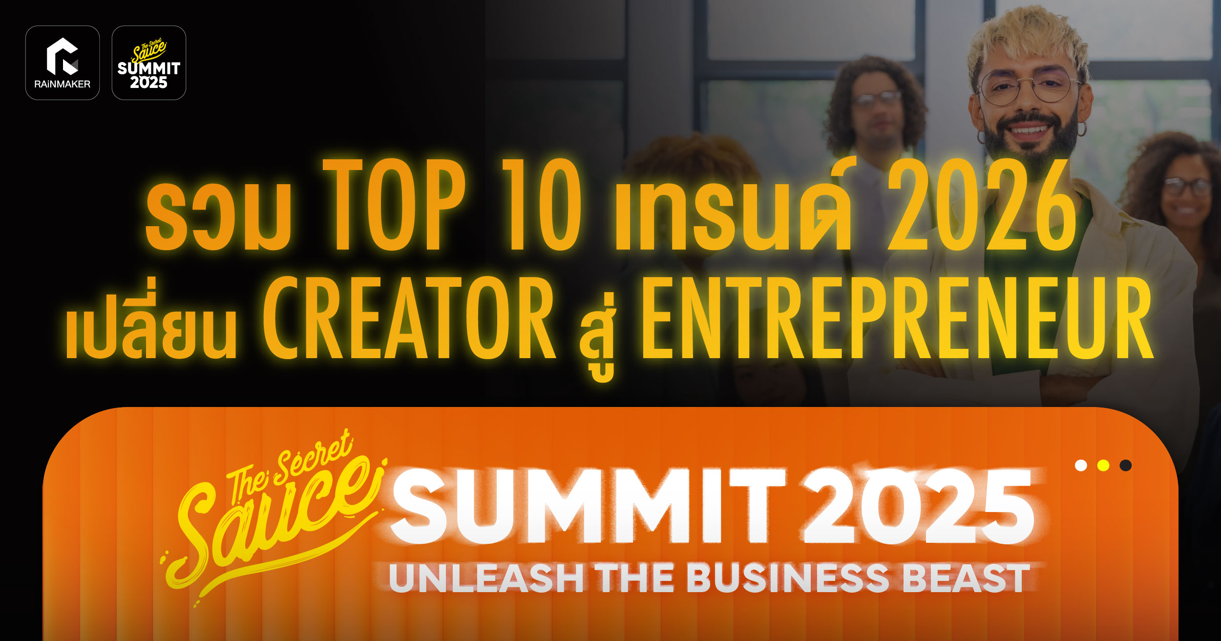 ปัจจุบันวงการคอนเทนต์ไม่ได้เผชิญแค่เรื่องการตามเทรนด์ หรือการสร้างภาพจำกับคนดูผ่านช่องทางแพลตฟอร์มต่าง ๆ เพียงเท่านั้น แต่ยังต้องเผชิญกับปัญหาการยืนระยะ ที่ทั้งครีเอเตอร์หน้าใหม่หรือทำมานานต่างก็มียอมแพ้กันไประหว่างทาง ซึ่ง Top 10 เทรนด์ 2026 ที่เป็นบทความพิเศษระหว่าง RAiNMaker x The Secret Sauce Summit 2025 ในวันนี้ จะมาแชร์ให้รู้กันว่าการเปลี่ยนจากครีเอเตอร์สู่ผู้ประกอบการจะต้องอัปเดตเทรนด์แบบไหน เพื่อให้การทำคอนเทนต์ยืนระยะ และเตรียมตัวสู่ 2026 ได้ก่อนใคร