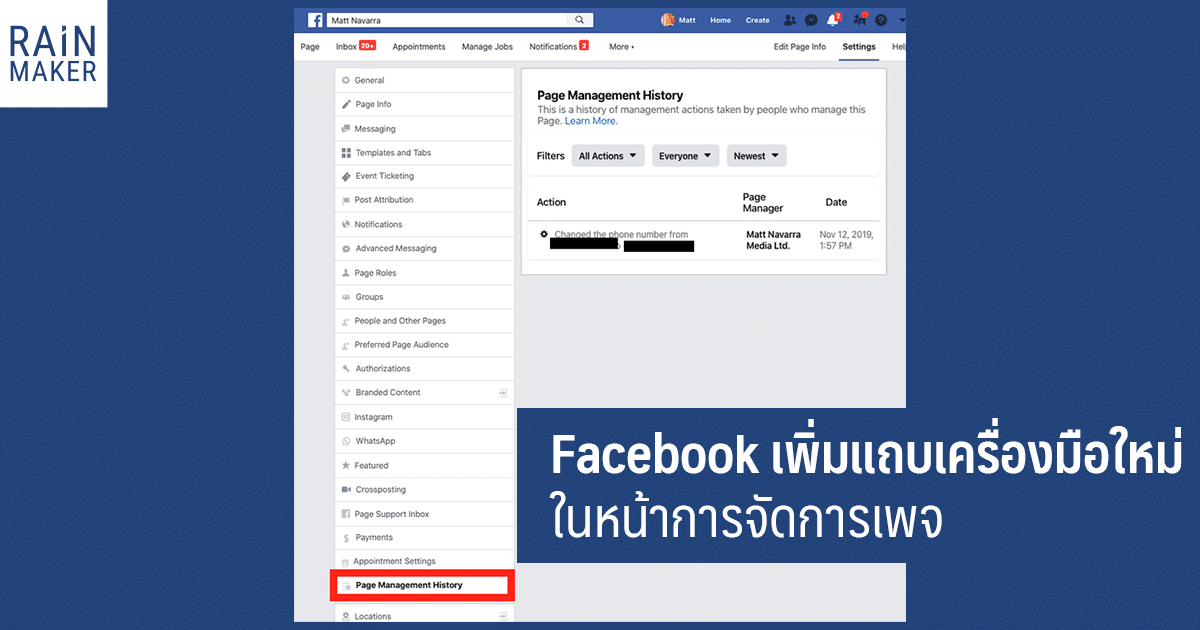 เฟซบุ๊กได้เพิ่มเครื่องมือ “ Page Management History ” เอาใจแอดมินเพจทั้งหลาย โดยเป็นหน้าที่ใช้สำหรับดูภาพรวมของเพจ ว่ามีการทำกิจกรรมอะไรไปบ้าง โดยเราสามารถ Filters เลือกดูได้ ว่าจะดูกิจกรรมใด จากใครเป็นผู้แก้ไข