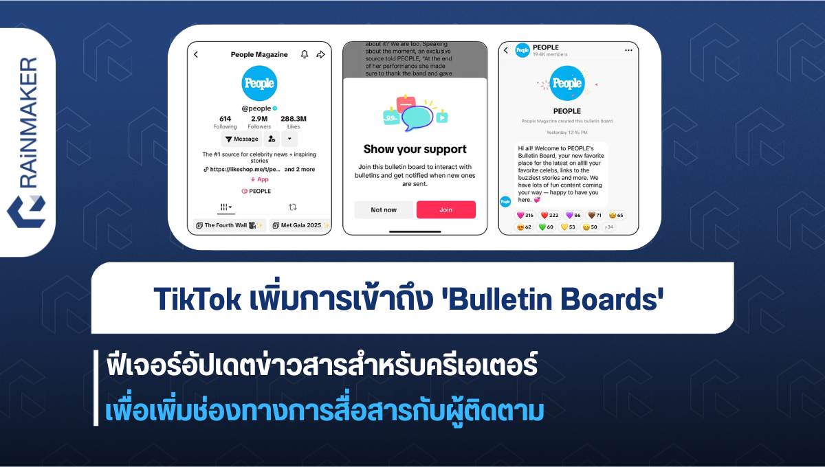 Bulletin Board ฟีเจอร์ใหม่บน TikTok ช่องทางสื่อสารใหม่ภายในแอปที่ช่วยให้ครีเอเตอร์สามารถแชร์คอนเทนต์ เพื่อกระจายข้อความแบบ One-to-Many โดยตรงกับผู้ติดตามเช่นเดียวกับ Broadcast จาก Instagram ทำให้ครีเอเตอร์สามารถโพสต์ข่าวสาร, อัปเดตเรียลไทม์ และสร้างคอมมูนิตี้ที่แข็งแรงบนแพลตฟอร์มได้ง่ายยิ่งขึ้น