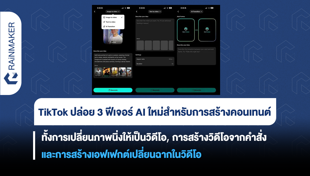 หลังจากที่ TikTok เปิดตัว Smart Split ฟีเจอร์ตัดต่อวิดีโอยาวให้กลายเป็นคลิปสั้น ๆ ด้วย AI ตอนนี้แพลตฟอร์มได้ปล่อย 3 ฟีเจอร์ใหม่สำหรับการสร้างสรรค์คอนเทนต์เพิ่มเติม ไม่ว่าจะเป็นการเปลี่ยนภาพนิ่งให้เป็นวิดีโอ (Animate Still Images), การสร้างวิดีโอจากคำสั่ง (Text-to-Video) หรือการสร้างเอฟเฟกต์เปลี่ยนฉากในวิดีโอ (AI Transitions) ซึ่งทั้งหมดสามารถใช้งานจากหน้า TikTok Composer โดยตรง