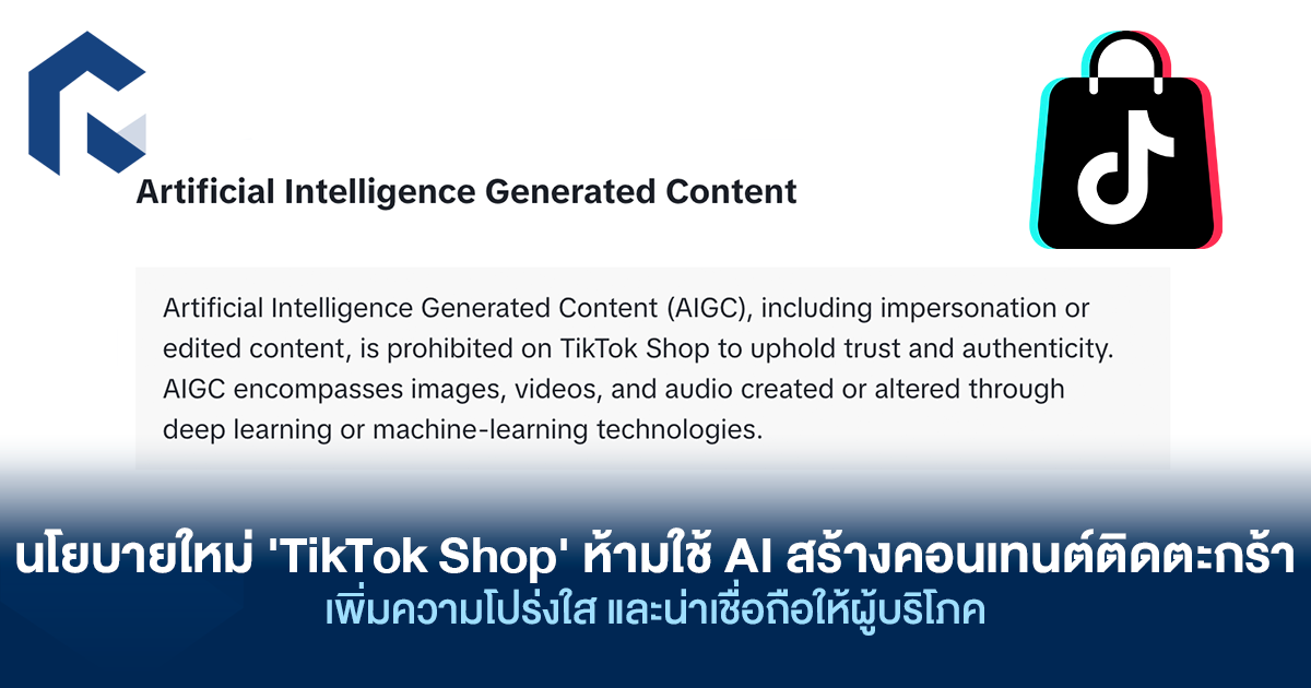 ล่าสุด TikTok Shop เพิ่มนโยบายแบนเนื้อหาที่สร้างด้วย AI ว่า ‘Artificial Intelligence Generated Content (AIGC), including impersonation or edited content, is prohibited on TikTok Shop to uphold trust and authenticity’ หรือ ห้ามเผยแพร่เนื้อหาที่สร้างขึ้นโดยปัญญาประดิษฐ์ (AIGC) รวมถึงเนื้อหาที่เป็นการเลียนแบบบุคคลหรือเนื้อหาที่ถูกตัดต่อด้วย