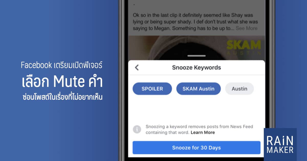 ใครที่เล่น Twitter ก็จะรู้ว่า Twitter มีฟีเจอร์ให้เราเลือก Mute Hashtag ที่เราไม่อยากจะเห็นได้ นั่นทำให้เราสามารถเลือกที่จะควบคุมสิ่งที่เราจะเห็นบนหน้า Feed ได้ตามที่เราต้องการ ล่าสุด Facebook ก็ได้ออกฟีเจอร์ใหม่ในชื่อว่า Keyword Snooze โดยฟีเจอร์นี้จะช่วยให้เราสามารถเพิ่ม Keyword หรือคำ ที่เราไม่ต้องการจะเห็น จากนั้น Facebook จะไม่นำโพสต์ที่มีคำเหล่านี้มาแสดงในหน้า Feed