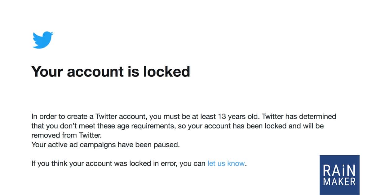 Twitter ได้มอบของขวัญวันเกิดปีที่ 20 ให้กับทุกคนด้วยการล็อกบัญชี Twitter พร้อมบอกว่าจะทำการลบบัญชีผู้ใช้นั้น เป็นเวลาหนึ่งอาทิตย์แล้วนับตั้งแต่หลายคนเจอปัญหา โดน Twitter ล็อกบัญชีเนื่องจากโดน Twitter ตรวจพบว่าทำการสมัครเข้ามาใช้งาน Twitter ก่อนจะมีอายุครบ 13 ปี