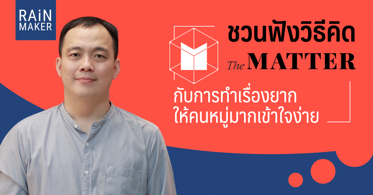 ในยุคที่มีการแข่งขันของข้อมูลบนโลกออนไลน์สูง โดยเฉพาะข้อมูลยากๆ หรือการรายงานข่าวต่างๆ ที่ The MATTER ไม่ได้เพียงแค่รายงานข่าว แต่เป็นการนำเสนอข่าวในรูปแบบการเล่าเรื่องที่เข้าใจง่าย เข้าถึงคนหมู่มาก ไม่ว่าจะเป็นการใส่มุขตลก หรือมีความแซะอยู่หน่อยๆ ทำให้ทีมงาน RAiNMaker อยากรู้วิธีคิดคอนเทนต์ของพวกเขา ผ่านการคุยกับ “พงศ์พัฒน์ บัญชานนท์” บรรณาธิการบริหาร The MATTER ถึงวิธีการคิดเรื่องยาก ให้คนหมู่มากเข้าใจง่าย