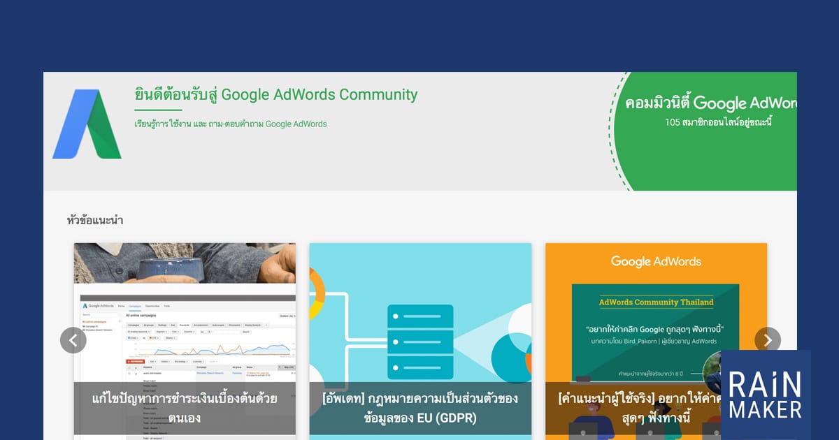 ใครที่เป็นเจ้าของเว็บไซต์หรือเป็นทีมการตลาด ทีมคอนเทนต์ ก็คงจะรู้จักกับ Google AdWords บริการซื้อโฆษณาบน Google Search และ Google Analytic บริการ Analytic ที่ให้เราดูสถิติ ประเมินผล และดูข้อมูลเกี่ยวกับผู้เข้าชมเว็บไซต์ของเรา ซึ่งล่าสุด Google ได้ทำการเปิดตัว AdWords Community ซึ่งเป็นชุมชนคนทำ AdWords และผู้ใช้งาน Google Analytic ในประเทศไทย