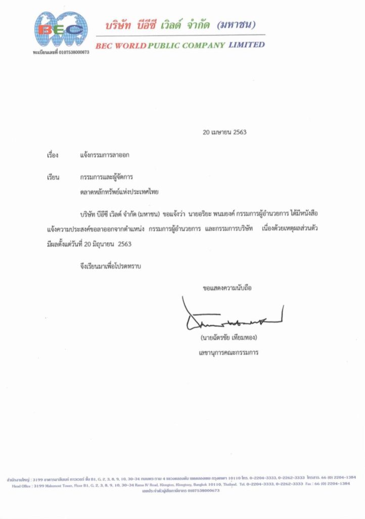 ในวันนี้(20 เมษายน) ทางบีอีซี เวิลด์ แจ้งว่าคุณอริยะ พนมยงค์ กรรมการผู้อำนวยการ ได้มีหนังสือแจ้งความประสงค์ของลาออกจากตำแหน่ง กรรมการผู้อำนวยการและกรรมการบริษัท เนื่องด้วยเหตุผลส่วนตัว มีผลตั้งแต่วันที่ 20 มิถุนายน 2563 เป็นต้นไป