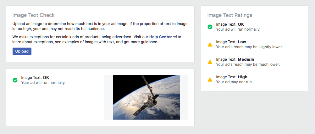 สามารถเข้าได้จาก Facebook Text Overlay Checker ซึ่งวิธีการใช้งานเครื่องมือตัวนี้ก็จะเป็นการ อัพโหลดรูปภาพ ให้เราอัพโหลดรูปภาพที่ต้องการจะใช้ในการลงโฆษณาลงไป แล้วดูผลที่ได้ ซึ่งทาง Facebook ได้แบ่งกรณีออกเป็นตามนี้