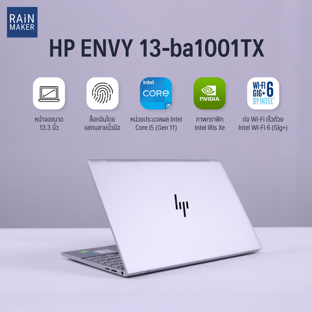 HP ENVY 13-ba1001TX สี Silver กับหน้าจอขนาด 13.3 นิ้ว ขนาด 30.65 x 19.46 x 1.69 ซ.ม. น้ำหนักเพียง 1.3 ก.ก. เท่านั้น แถมยังสามารถแสกนนิ้วเพื่อล็อกอินเครื่องได้ และมาพร้อมกับหน่วยประมวลผล Intel Core i5-1135G7 ที่มีความเร็วในการประมวลผลตั้งแต่ 2.40 GHz ได้สูงสุดถึง 4.20 GHz ด้วย Turbo Boost 4 Cores 8MB Cache หน่วยความจำ 8GB ความจุเครื่อง 512GB