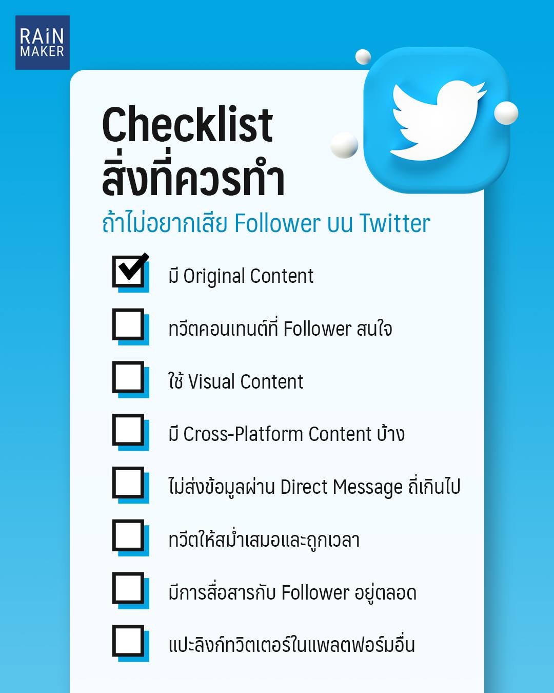 ยอด Follower ไม่ใช่ทั้งหมด แต่ก็เป็นค่านึงที่สามารถใช้วัดผลได้ว่าแอคเคานต์และคอนเทนต์ของเรามีการพัฒนาขึ้นหรือไม่ เพราะฉะนั้นการมียอดผู้ติดตามในจำนวนนึงที่อยู่กับเราก็นับจุดเริ่มต้นที่ดีในการจะต่อยอดทำกิจกรรมอื่นๆ ซึ่งหลายคนอาจกังวลว่าแล้วจะรักษายอด Follower บน Twitter ยังไงดีล่ะ วันนี้ RAiNMaker เลยทำ Checklist มาให้ทุกคนลองเช็กกันว่าเราได้ทำในสิ่งที่ควรทำเพื่อรักษายอดผู้ติดตามไว้หรือยัง มีอะไรบ้างไปรีบเช็กกันเลยดีกว่า!