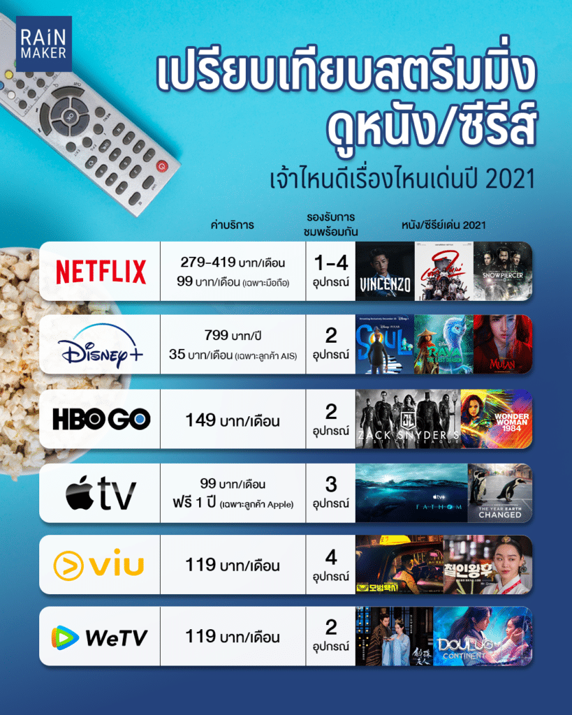 วันนี้ RAiNMaker ขอพาสำรวจแพลตฟอร์มสตรีมมิ่งเด่นๆ ในไทย รวมถึงแนะนำหนัง-ซีรีส์เด่นของแต่ละเจ้าในปี 2021 ด้วย