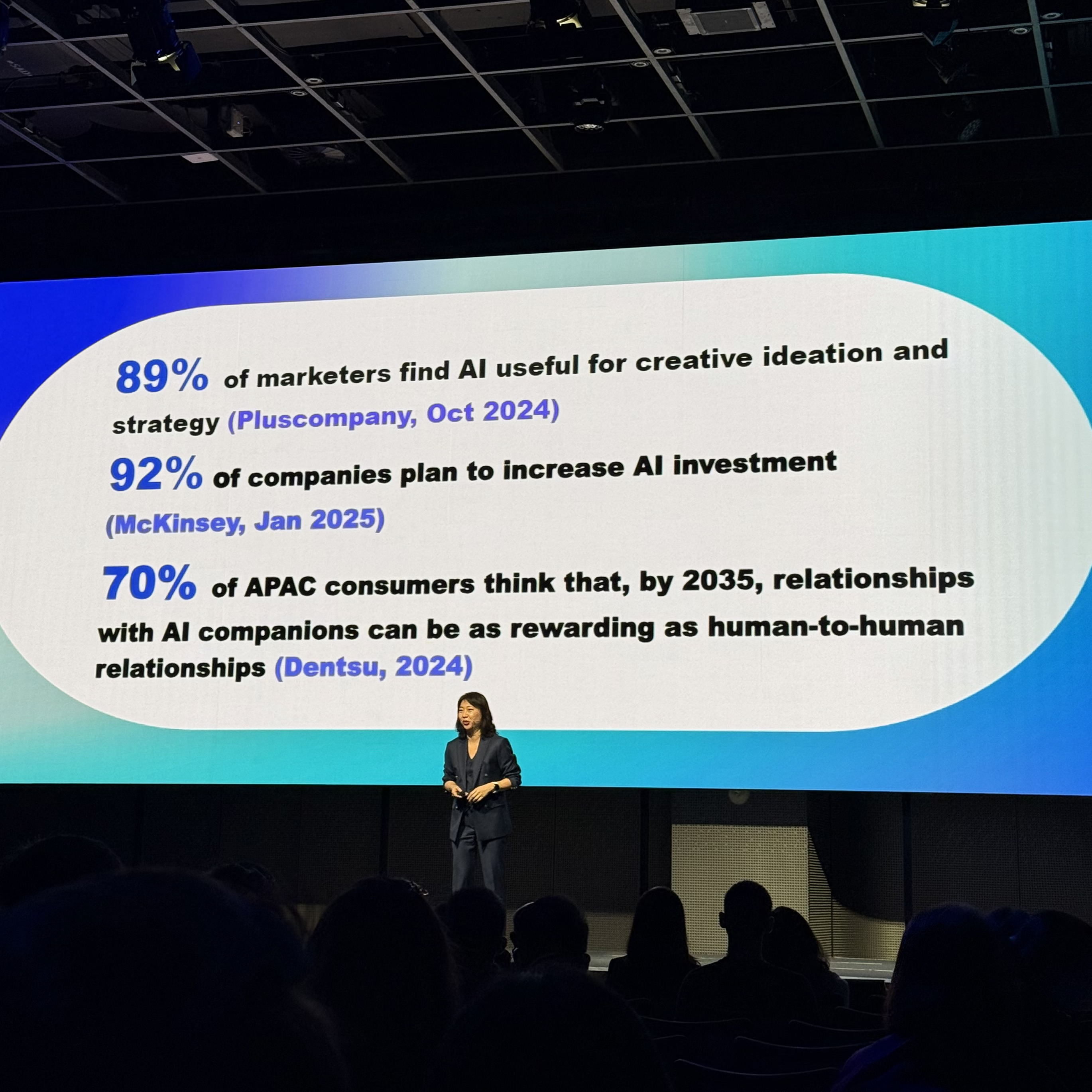 เช่น Playful Feature ใน TikTok ฟิลเตอร์เพิ่มอายุเพื่อให้เห็นหน้าตาเราในอนาคต หรือ AI Clones บน Instagram ที่จากสถิติพบว่า 49% ของผู้ใช้อยากมีร่างโคลนนิ่งของตัวเองเพื่อประหยัดเวลาการทำงาน เพื่อใช้ชีวิตมากขึ้น