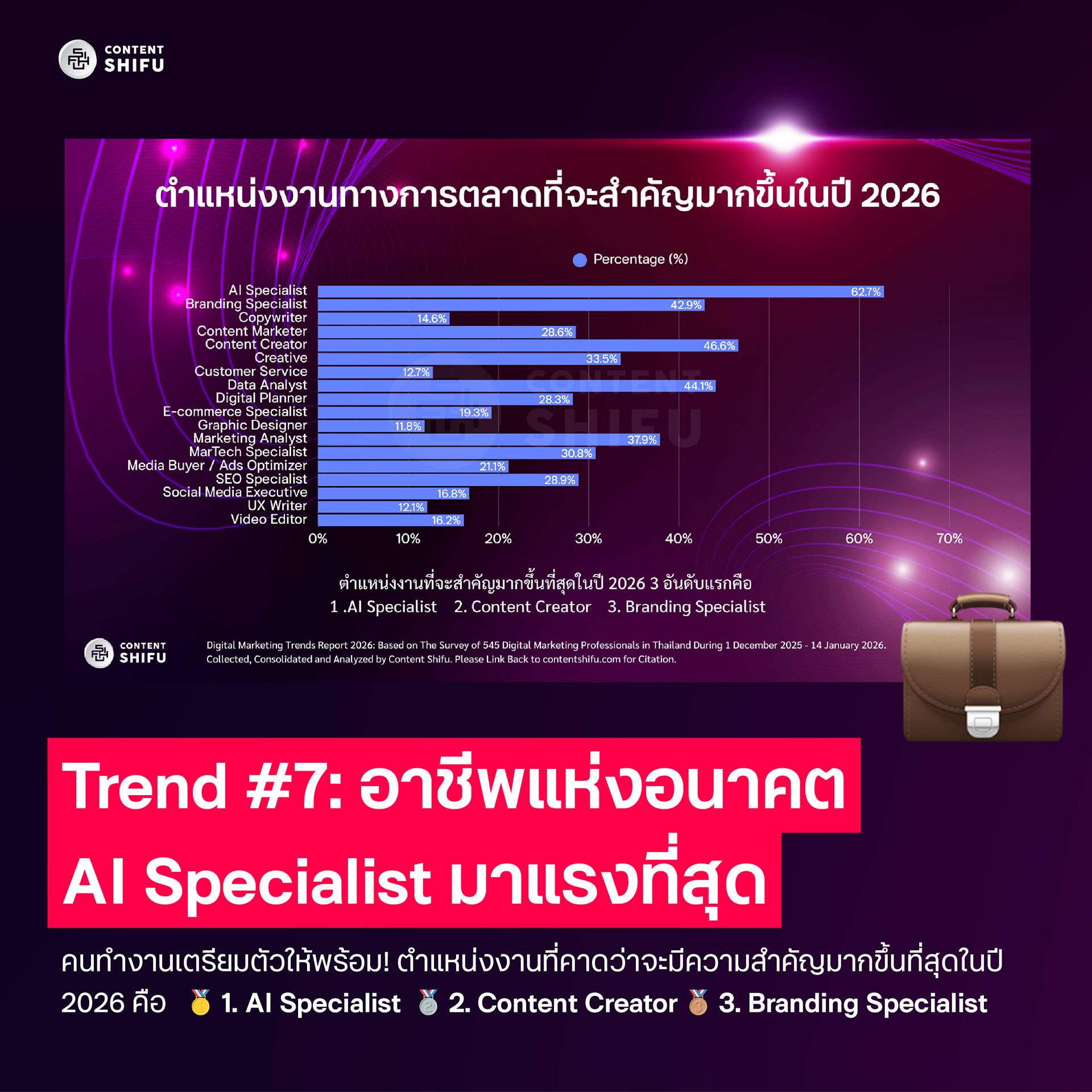 ตำแหน่ง AI Specialist ถูกมองว่าเป็นอาชีพที่มีความสำคัญมากที่สุดในปี 2026 ตามมาด้วย Content Creator และ Branding Specialist แสดงให้เห็นว่าองค์กรต้องการทักษะเชิงลึกมากกว่าการใช้งานเครื่องมือทั่วไป