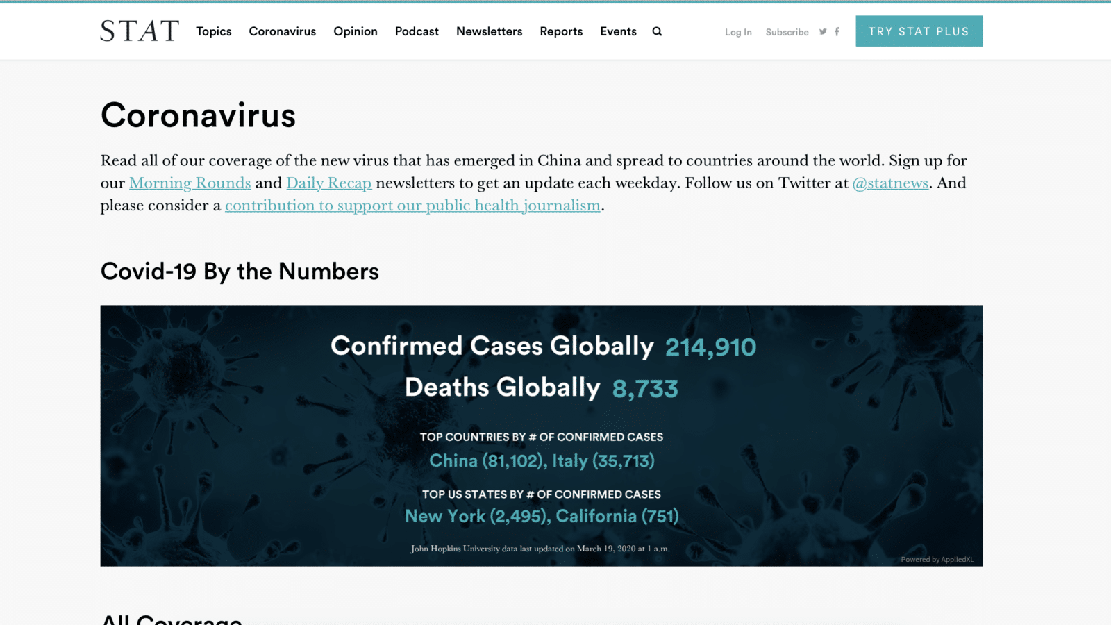 STAT เว็บไซต์ด้าน Report และข้อมูลวิเคราะห์เชิงลึกด้านสุขภาพและวิทยาศาตร์จาก Boston Globe Media จากเดิมที่มีราคาในการอ่านสูงมาก (ออกแนวกึ่ง ๆ Journal ด้วยซ้ำ) ก็มาทำหน้า Report อัพเดทกรณี COVID-19 ให้ได้นำรางานไปใช้ฟรี ๆ เช่นกัน