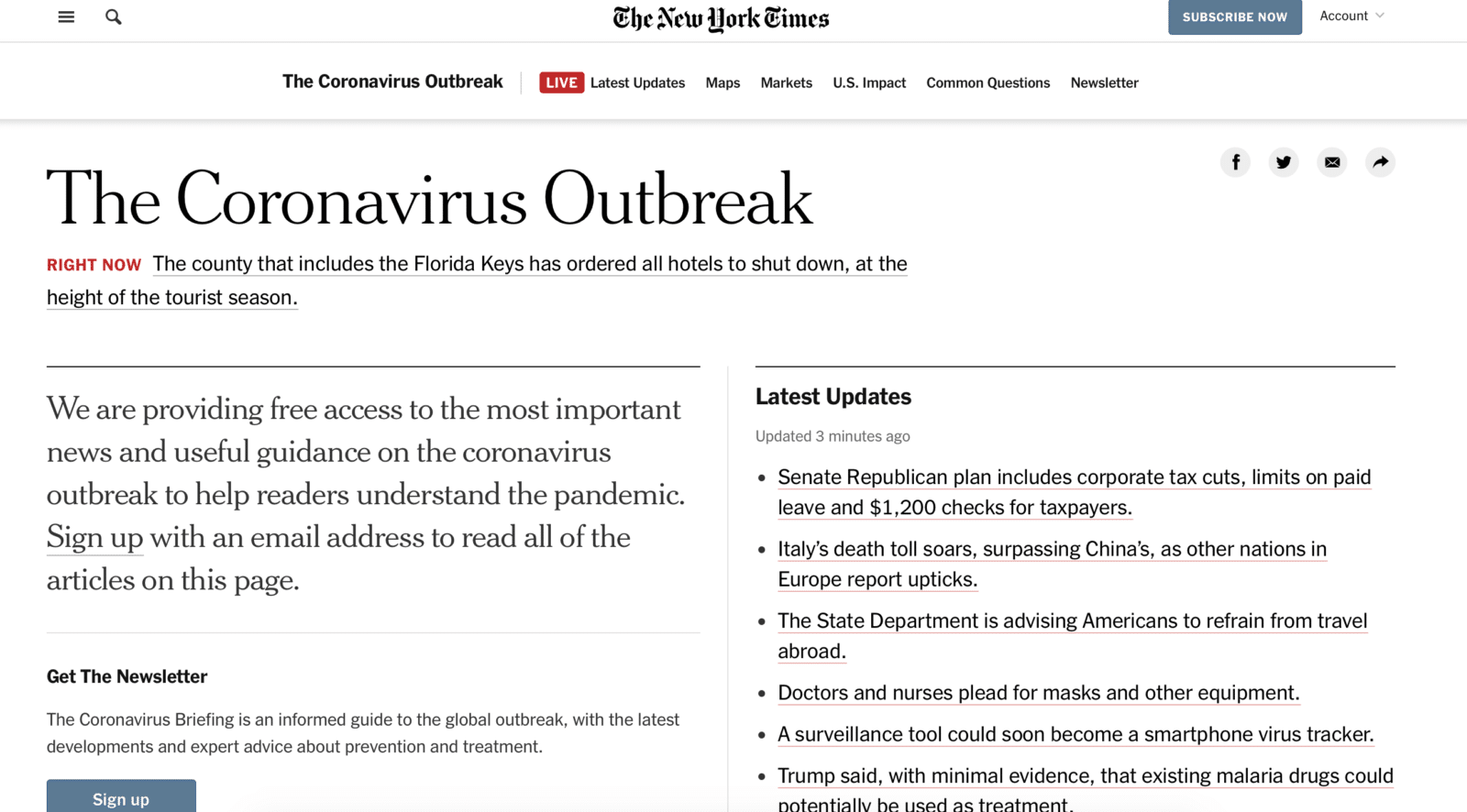 ในบทความ ยกตัวอย่าง Wall Street Journal ที่เปิด Section พิเศษเพื่อทำข่าวเรื่อง COVID-19 โดยเฉพาะ จากเดิมที่เราจะรู้จัก WSJ ในฐานะผู้ที่มี Paywall อันแข็งแกร่งแต่คนก็ยอมจ่ายเพราะการรายงานข่าวที่วิเคราะห์อย่างน่าสนใจ ส่วน The New York Times ก็นำคอนเทนต์ที่เป็น COVID-19 ออกจาก Paywall และรายงาน วิเคราะห์ ข่าวสารดังกล่าวให้ทุกคนเข้าถึงได้
