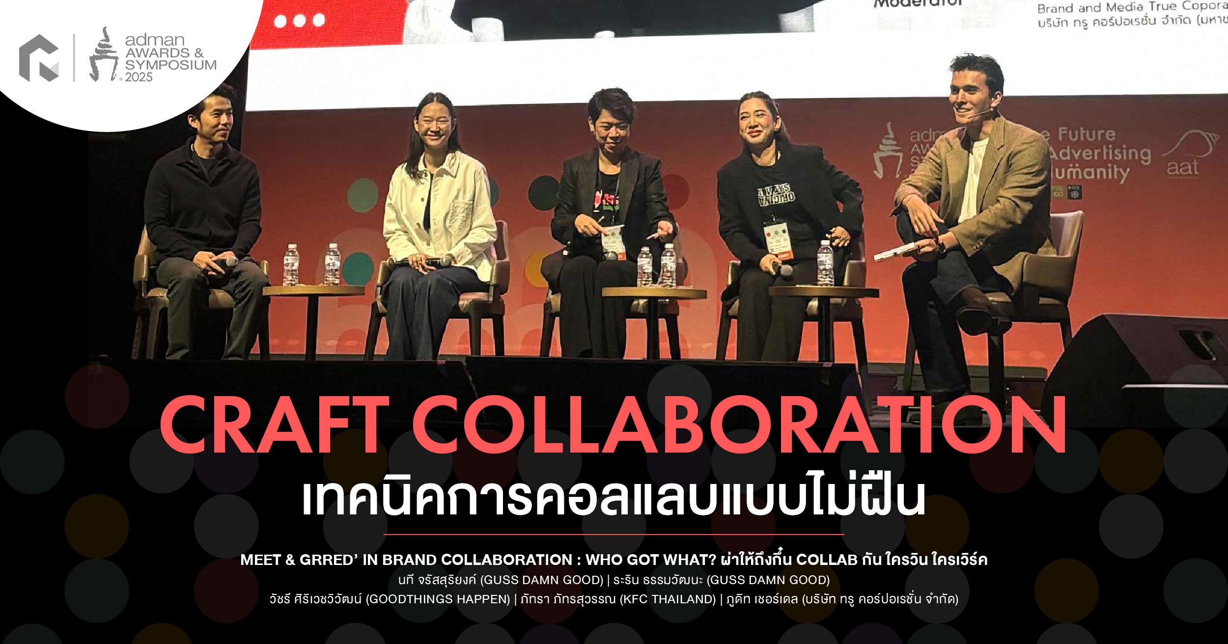 สรุป Craft Collaboration เทคนิคการคอลแลบแบบไม่ฝืน จาก Session: Meet & Grred’ in Brand Collaboration : Who got what? ผ่าให้ถึงกึ๋น Collab กัน ใครวิน ใครเวิร์ค ที่งาน Adman Awards And Symposium 2025: The Future Of Advertising Is Humanity โดย นที จรัสสุริยงค์ (Guss Damn Good), ระริน ธรรมวัฒนะ (Guss Damn Good), วัชรี ศิริเวชวิวัฒน์ (Goodthings Happen), ภัทรา ภัทรสุวรรณ (KFC Thailand) และภูดิท เชอร์เดล (บริษัท ทรู คอร์ปอเรชั่น จำกัด)