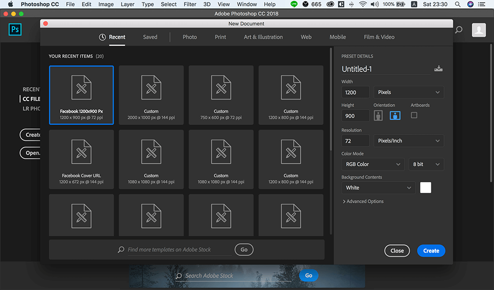 ในส่วนของเวอร์ชั่นได้ใช้ Photoshop CC 2018 ในการอธิบายและสำหรับการตั้งค่าไฟล์เราก็ใช้วิธีการเดียวกับการสร้าง Artwork ใหม่โดยไปกดที่ File  > New ระบบจะทำการเปิดหน้า New Document ขึ้นมาตามภาพด้านล่าง