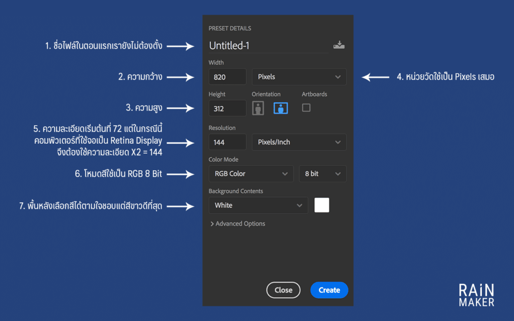 เมื่อรู้ขนาดของไฟล์แล้วให้เรามาตั้งค่าไฟล์กันต่อ โดยการกรอกรายละเอียดต่างๆนั้นจะไล่ใส่ไปทีละช่องตามภาพด้านล่าง