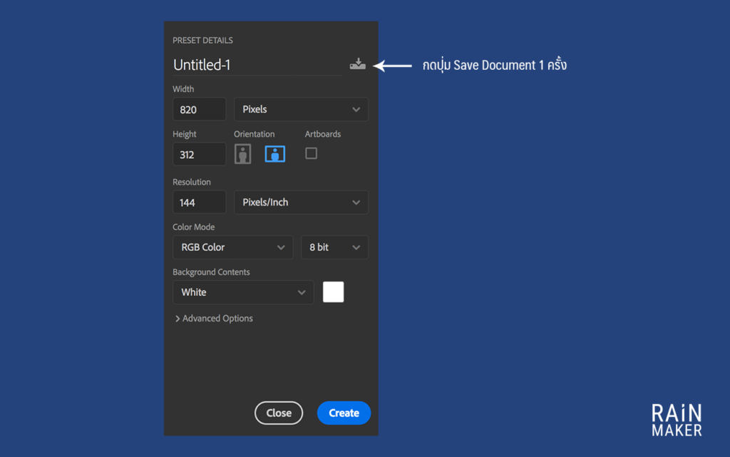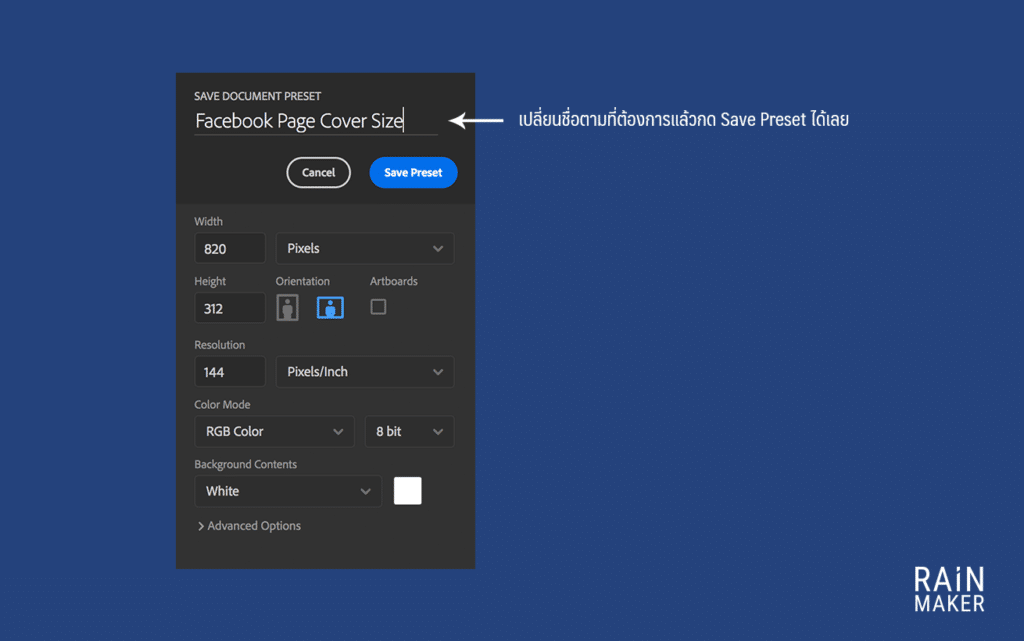 หลังจากกดปุ่ม Save Document หน้าตาของการตั้งค่าไฟล์จะเปลี่ยนไป แต่ตัวเลขและหน่วยวัดต่างๆที่ได้ตั้งค่าเอาไว้ตอนแรกยังเป็นเหมือนเดิม ในขั้นตอนนี้ให้เราใส่ชื่อ Template ลงไปแล้วกด Save Preset ได้