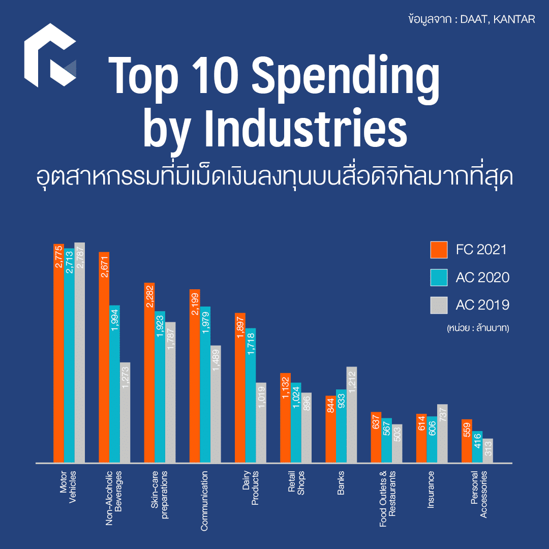 สำหรับอุตสาหกรรมที่มีเม็ดเงินลงทุนบนสื่อดิจิทัลมากที่สุดยังคงเป็น อุตสาหกรรมยานยนต์ (2,775 ล้านบาท) ตามด้วยกลุ่มเครื่องดื่มปราศจากแอลกอฮอล์ (2,671ล้านบาท) ที่มาแรง เนื่องจากสถานการณ์ที่ส่งเสริมให้คนกักตุนสินค้าในช่วงล็อกดาวน์มากขึ้น