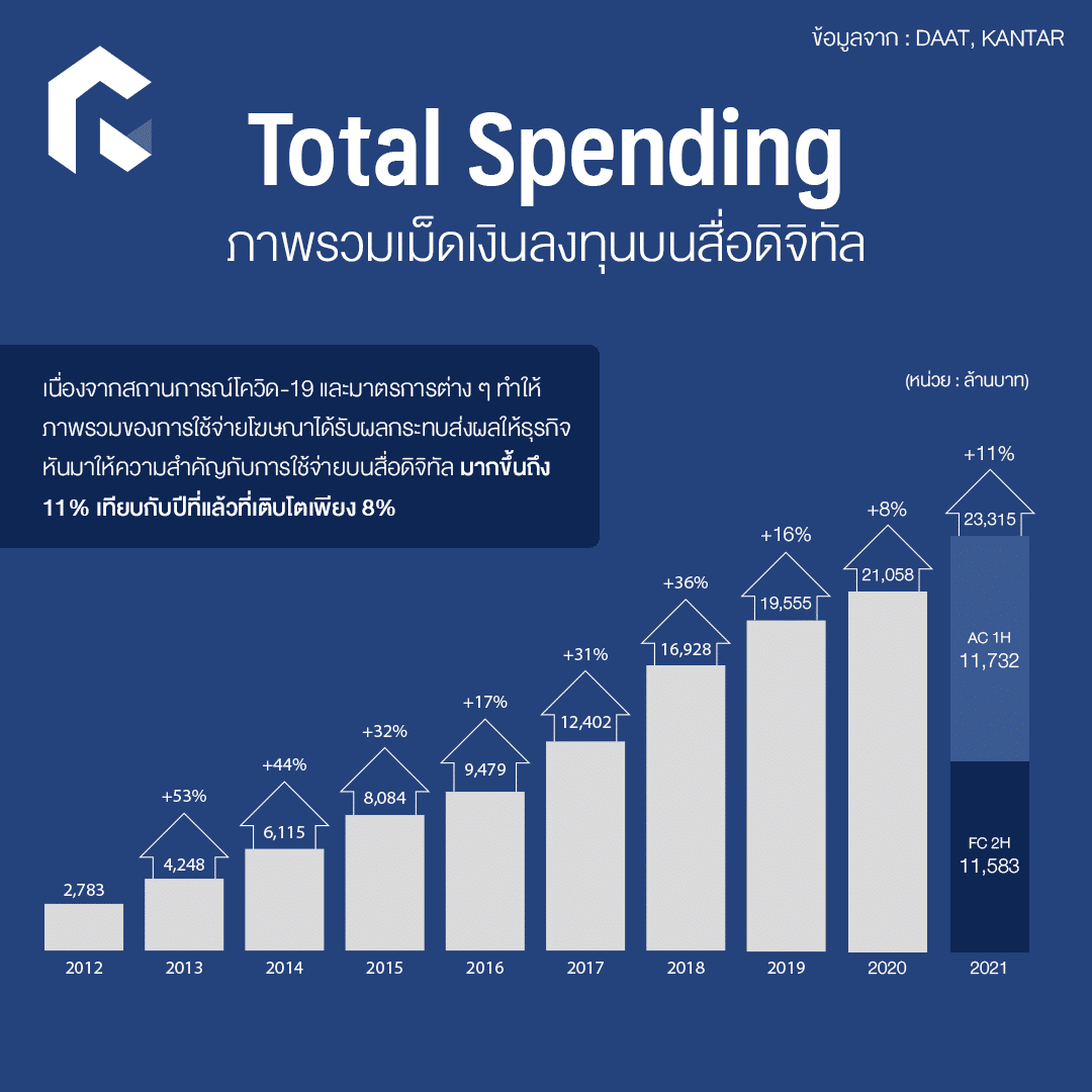 เนื่องจากสถานการณ์โควิด-19 และมาตรการต่าง ๆ ของรัฐบาล ทำให้ภาพรวมของการใช้จ่ายโฆษณาได้รับผลกระทบค่อนข้างมาก ส่งผลให้ธุรกิจหันมาให้ความสำคัญกับการใช้จ่ายบนสื่อดิจิทัลมากขึ้น สื่อดิจิทัลได้รับผลกระทบค่อนข้างน้อยที่สุดเมื่อเทียบกับสื่อด้านอื่น ๆ