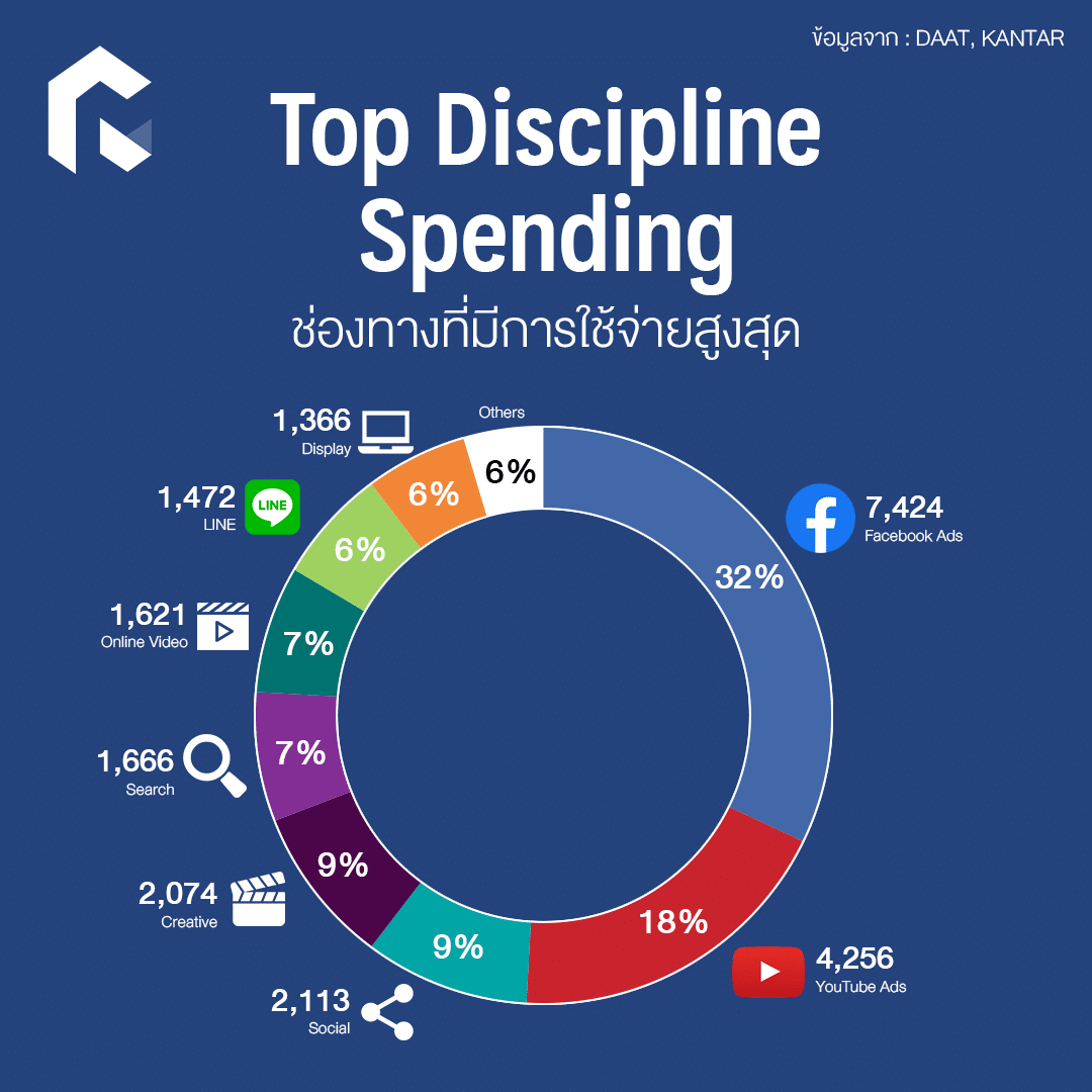 ส่วนช่องทางที่มีการใช้จ่ายมากที่สุดยังคงเป็นเฟซบุ๊ก (Facebook) คิดเป็น 32% อยู่ที่ 7,424 ล้านบาท ตามด้วยยูทูบ (YouTube) คิดเป็น 18% 4,256 ล้านบาท แต่มีการคาดการณ์ว่ายูทูบจะมียอดการใช้จ่ายลดลง 7% เนื่องจากการกระจายการลงทุนผ่านแพลตฟอร์มวิดีโออื่น ๆ มากขึ้น อย่างบริการสตรีมมิง