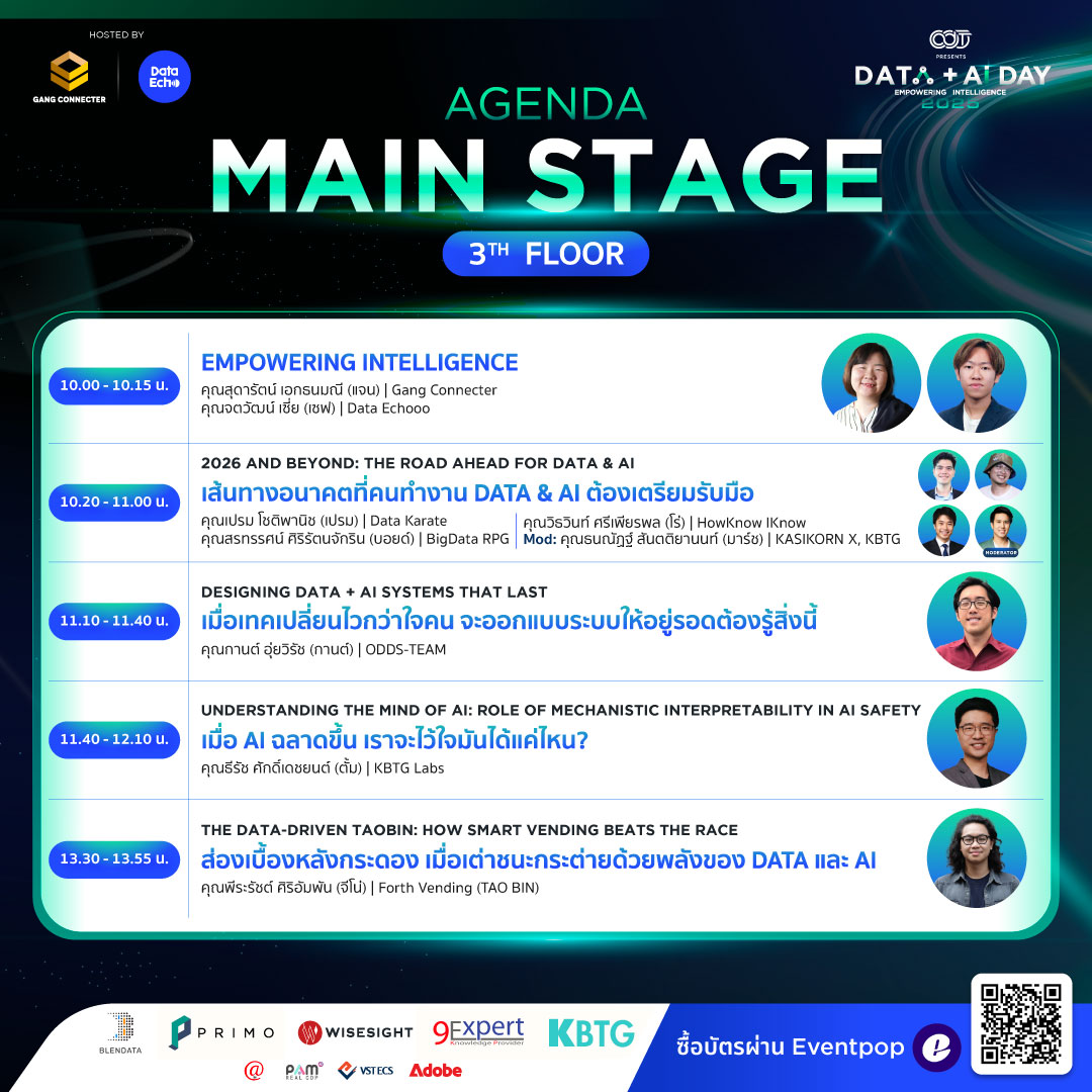 โอกาสเดียวที่จะได้อัปเดตเทรนด์ Data & AI จากผู้เชี่ยวชาญ นำไปต่อยอดการทำงานได้จริงและแลกเปลี่ยนมุมมองกับเพื่อนร่วมสายงานเทคฯ ภายในงาน DATA + AI Day 2025 งานที่รวมตัวคนสาย Data และ AI ของประเทศ