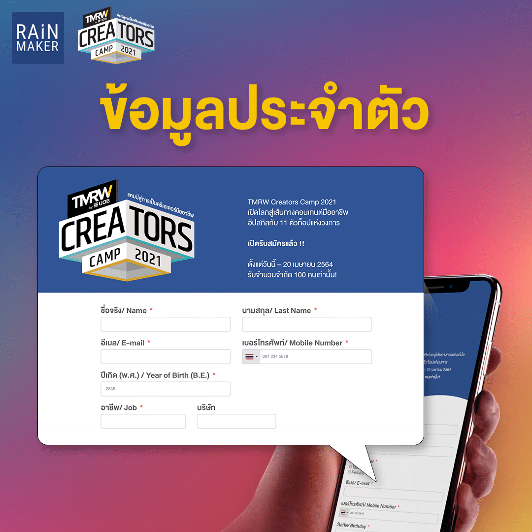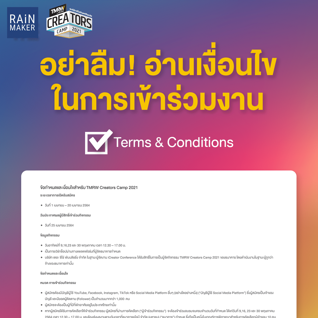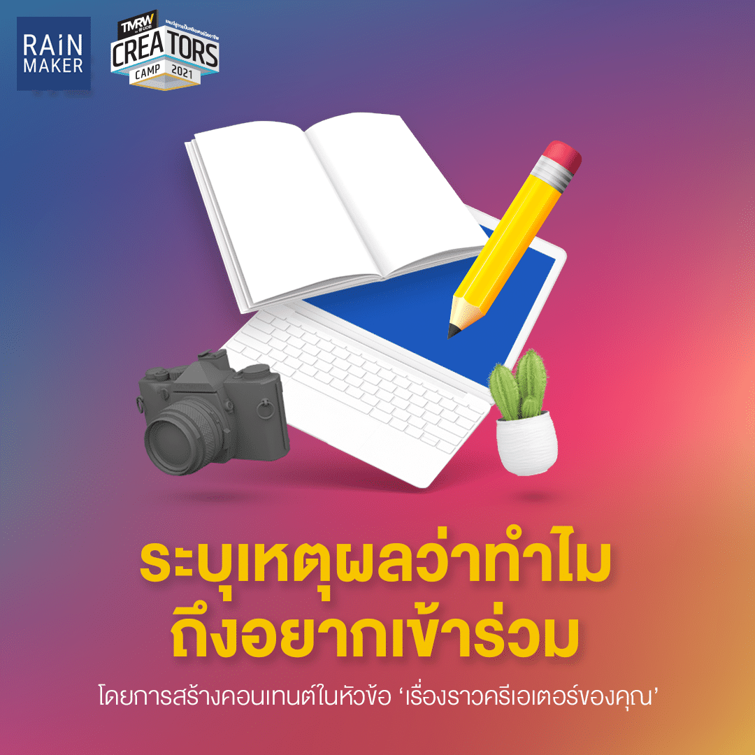 สอบถามรายละเอียดเพิ่มเติมได้ที่ Facebook: RAiNMaker #TMRWCreatorsCamp2021 #TMRW