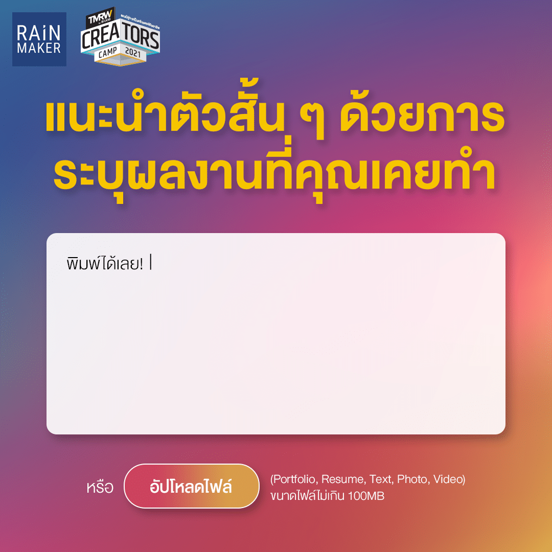 ระบุเหตุผลว่าทำไมถึงอยากเข้าร่วม TMRW Creators Camp 2021 โดยการสร้างคอนเทนต์ในหัวข้อ ‘เรื่องราวครีเอเตอร์ของคุณ’