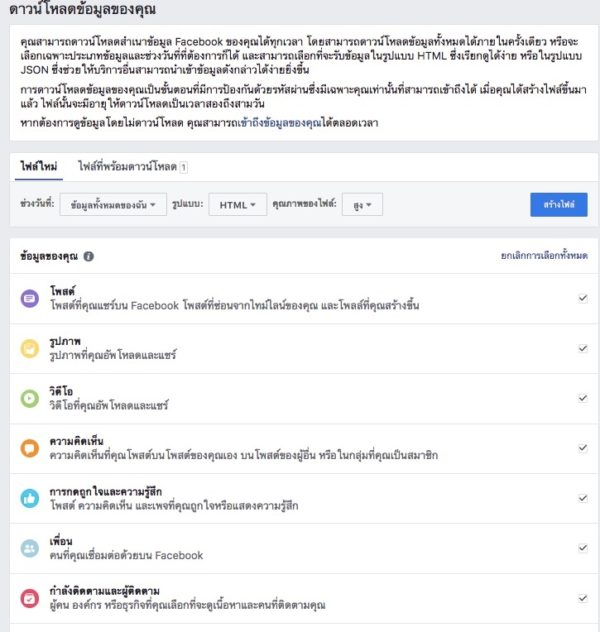 - ไปที่ตั้งค่า >> การตั้งค่าบัญชีผู้ใช้ทั่วไป ข้างล่างของหน้าเว็บจะมีให้เลือก “ดาวน์โลหดสำเนาข้อมูล Facebook ของคุณ