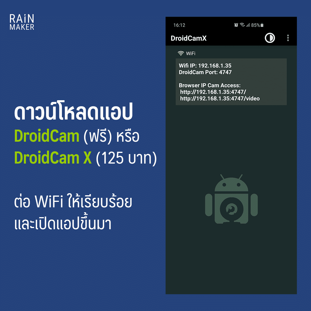 ก่อนอื่นให้เราไปดาวน์โหลดแอป DroidCam (ฟรี) ในมือถือของเราก่อน หรือถ้าใครมั่นใจว่าจะใช้ยาวๆ อยากได้ฟีเจอร์ครบๆ ก็สามารถซื้อ DroidCamX (125 บาท) ทีเดียวจบได้เหมือนกัน