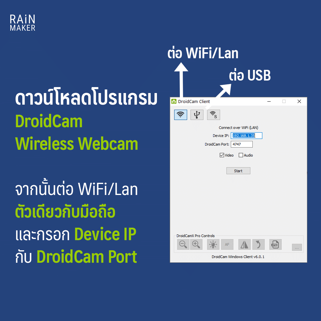จากนั้นให้เราต่ออินเทอร์เน็ตที่วงแลนเดียวกับมือถือของเรา (จะ WiFi หรือสาย Lan ก็ได้) (หรือใครจะใช้มือถือต่อคอมผ่าน USB แทนก็ทำได้เช่นกัน) และทำการกรอก Device IP กับ DroidCam Port ให้ตรงกับเลขที่ขึ้นบนจอมือถือ