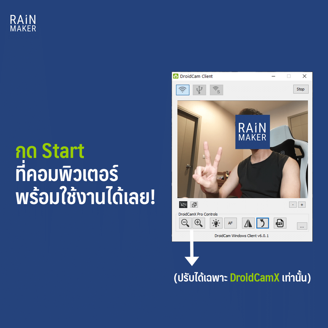 เมื่อทุกอย่างพร้อมก็กด Start ได้เลย จะมีรูปจากกล้องหลังมือถือเราขึ้นมาบนตัว client และคุณภาพวิดีโอจะคมชัดกว่าเว็บแคมทุกตัวในตลาดอย่างแน่นอน